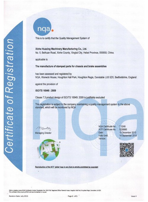 公司具有模具设计制造能力(模具设计开发工程技术人员10余人,模具车间加工中心、数控铣、电火花线切割等设备齐全),具备从模具设计制造、液压、冲压、机械加工、组合焊接、热处理、检验为一体的完善的生产制造体系。实现了从原材料入厂、各工序加工制造、到成品入库发出全部由厂内完成,质量管控能力强,降低了生产成本,提高了产品竞争力。公司生产的汽车用底盘悬挂冲压件、拉伸组合件、轿车前后摆臂、发动机主横梁、油封座圈、转向节主销、后桥壳盖、防尘盘、调整垫片等产品质量稳定,供货及时。